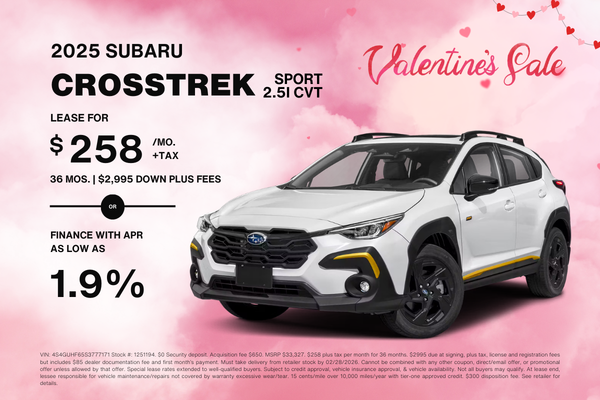VIN: 4S4GUHF65S3777171 Stock #: 1251194. $0 Security deposit. Acquisition fee $650. MSRP $33,327. $258 plus tax per month for 36 months. $2995 due at signing, plus tax, license and registration fees but includes $85 dealer documentation fee and first month’s payment. Must take delivery from retailer stock by 02/28/2026. Cannot be combined with any other coupon, direct/email offer, or promotional offer unless allowed by that offer. Special lease rates extended to well-qualified buyers. Subject to credit approval, vehicle insurance approval, & vehicle availability. Not all buyers may qualify. At lease end, lessee responsible for vehicle maintenance/repairs not covered by warranty excessive wear/tear. 15 cents/mile over 10,000 miles/year with tier-one approved credit. $300 disposition fee. See retailer for details.