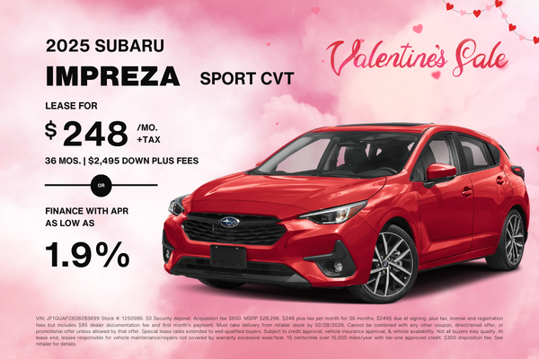 VIN: JF1GUAFC6S8283699 Stock #: 1250986. $0 Security deposit. Acquisition fee $650. MSRP $28,296. $248 plus tax per month for 36 months. $2495 due at signing, plus tax, license and registration fees but includes $85 dealer documentation fee and first month’s payment. Must take delivery from retailer stock by 02/28/2026. Cannot be combined with any other coupon, direct/email offer, or promotional offer unless allowed by that offer. Special lease rates extended to well-qualified buyers. Subject to credit approval, vehicle insurance approval, & vehicle availability. Not all buyers may qualify. At lease end, lessee responsible for vehicle maintenance/repairs not covered by warranty excessive wear/tear. 15 cents/mile over 10,000 miles/year with tier-one approved credit. $300 disposition fee. See retailer for details.