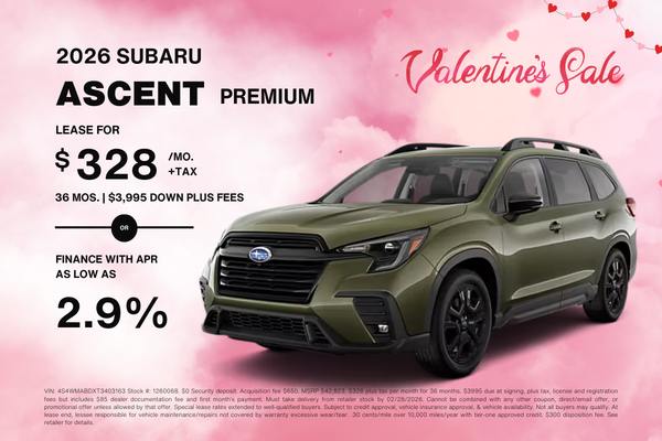 VIN: 4S4WMABDXT3403163 Stock #: 1260068. $0 Security deposit. Acquisition fee $650. MSRP $42,823. $328 plus tax per month for 36 months. $3995 due at signing, plus tax, license and registration fees but includes $85 dealer documentation fee and first month’s payment. Must take delivery from retailer stock by 02/28/2026. Cannot be combined with any other coupon, direct/email offer, or promotional offer unless allowed by that offer. Special lease rates extended to well-qualified buyers. Subject to credit approval, vehicle insurance approval, & vehicle availability. Not all buyers may qualify. At lease end, lessee responsible for vehicle maintenance/repairs not covered by warranty excessive wear/tear. .30 cents/mile over 10,000 miles/year with tier-one approved credit. $300 disposition fee. See retailer for details.