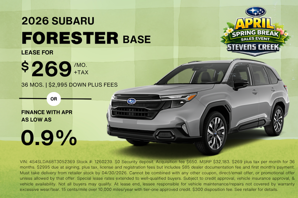 VIN: 4S4SLDA68T3052369 Stock #: 1260239. $0 Security deposit. Acquisition fee $650. MSRP $32,183. $269 plus tax per month for 36 months. $2995 due at signing, plus tax, license and registration fees but includes $85 dealer documentation fee and first month’s payment. Must take delivery from retailer stock by 04/30/2026. Cannot be combined with any other coupon, direct/email offer, or promotional offer unless allowed by that offer. Special lease rates extended to well-qualified buyers. Subject to credit approval, vehicle insurance approval, & vehicle availability. Not all buyers may qualify. At lease end, lessee responsible for vehicle maintenance/repairs not covered by warranty excessive wear/tear. 15 cents/mile over 10,000 miles/year with tier-one approved credit. $300 disposition fee. See retailer for details.