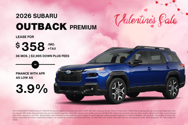 VIN: JF2BUPAD6TY470208 Stock #: 1260149 $0 Security deposit. Acquisition fee $650. MSRP $36,788. $358 plus tax per month for 36 months. $2995 due at signing, plus tax, license and registration fees but includes $85 dealer documentation fee and first month’s payment. Must take delivery from retailer stock by 02/28/2026. Cannot be combined with any other coupon, direct/email offer, or promotional offer unless allowed by that offer. Special lease rates extended to well-qualified buyers. Subject to credit approval, vehicle insurance approval, & vehicle availability. Not all buyers may qualify. At lease end, lessee responsible for vehicle maintenance/repairs not covered by warranty excessive wear/tear. 15 cents/mile over 10,000 miles/year with tier-one approved credit. $300 disposition fee. See retailer for details.
