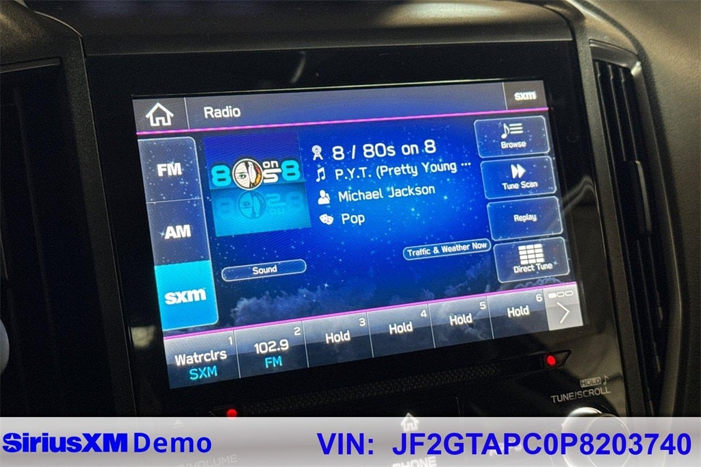 - Radio: Subaru STARLINK 6.5" Multimedia Plus System -inc: AM/FM stereo, HD Radio, single disc CD player w/MP3/WMA/CRR/RW file capability, multi-touch gesture high resolution display screen, voice activated controls, Bluetooth® audio streaming and hands-free phone connectivity, Bluetooth® hands-free SMS text messaging connectivity, iPod control capability, SiriusXM All Access Radio (4 months free trial/subscription required after), SiriusXM Travel Link (4 months free trial/subscription required after), smartphone integration: AHA, Android Auto, CarPlay, Pandora and STARLINK cloud applications, USB audio system update, steering wheel audio and Bluetooth® control switches, 6 speakers (2 dash panel tweeter, 2 front door and 2 rear door), 3.5mm auxiliary input jack and front dual USB A input/charge ports