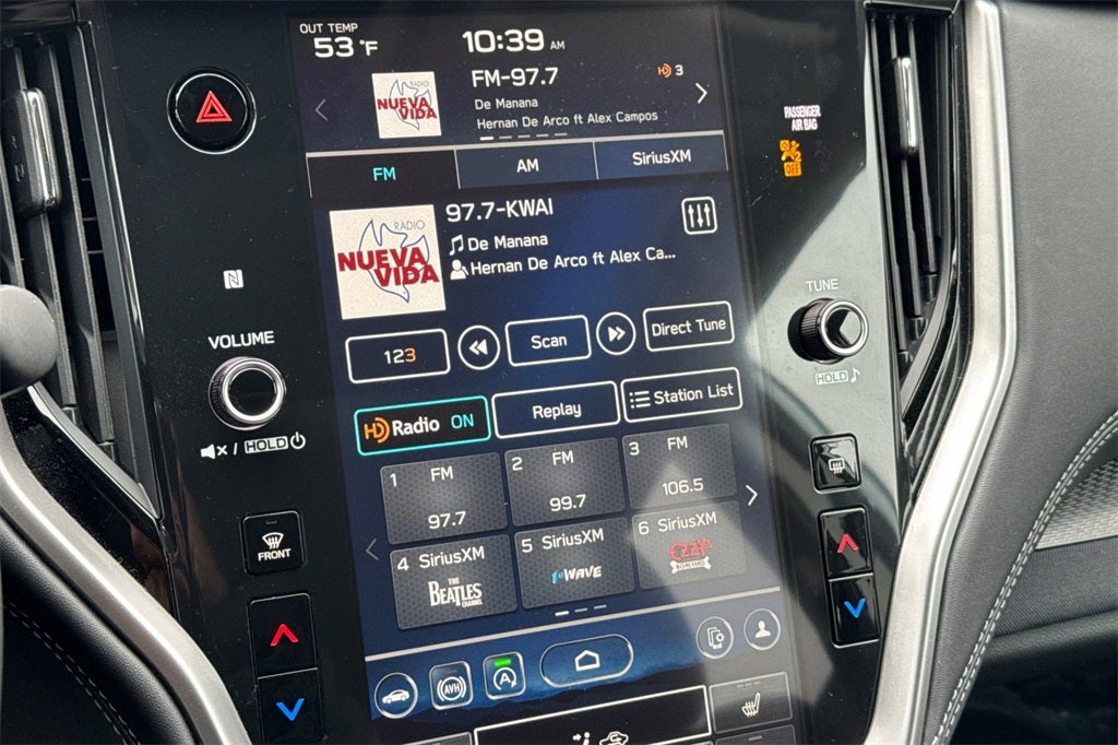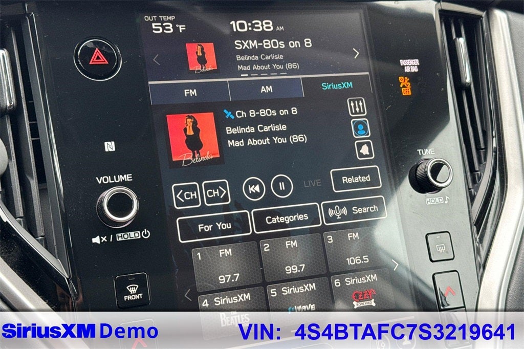 - Radio: Subaru 11.6" Multimedia Plus System -inc: AM/FM stereo, HD Radio, valet mode, multi-touch gesture high resolution display screen, voice activated controls, Bluetooth® audio streaming and hands-free phone connectivity w/SMS text messaging (refer to subaru.com for cell phone compatibility), Near Field Communication (NFC), iPod control capability, SiriusXM w/360L (4 months free trial/subscription required after), SiriusXM Travel Link (3 years free trial/subscription required after), smartphone integration for Android Auto and Apple CarPlay w/full screen view and wireless connection, USB and Over The Air (OTA) audio system update, audio system and Bluetooth® steering wheel control switches, 6 speakers, illuminated 3.5mm auxiliary input jack and illuminated USB-A and USB-C input/charge ports